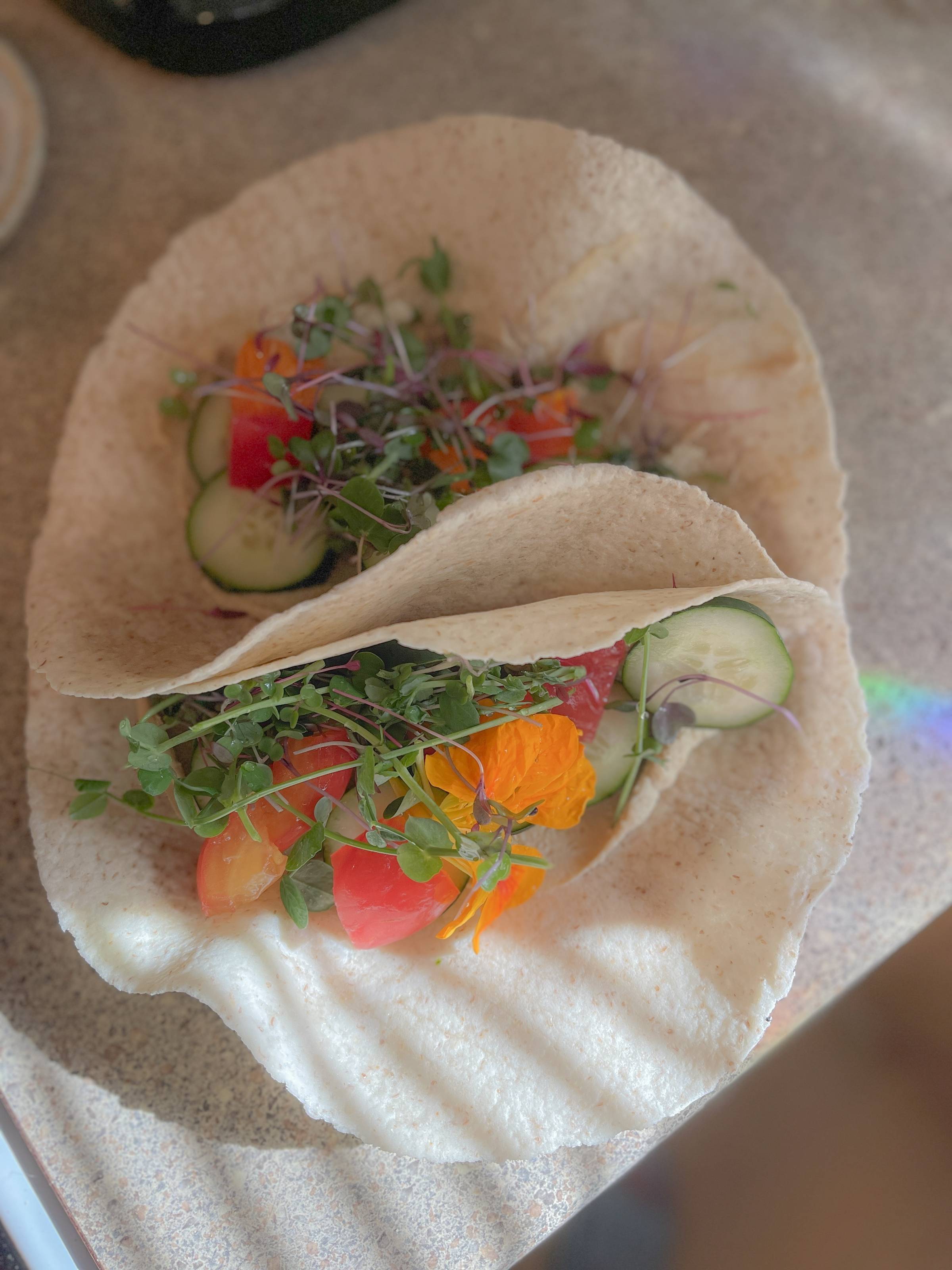 As someone who follows a plant-based diet, I eat a lot of vegetables. During the summer months, I especially love eating fresh veggies in wraps. It's one of the simplest lunches or snacks that I enjoy making (and eating). Depending upon which vegetables are in season, I'll change up what I include in my wrap. A special treat that I'll occasionally get from my farmers market is locally grown microgreens and edible flowers. For such a small ingredient, they really add beautiful flavor and color!